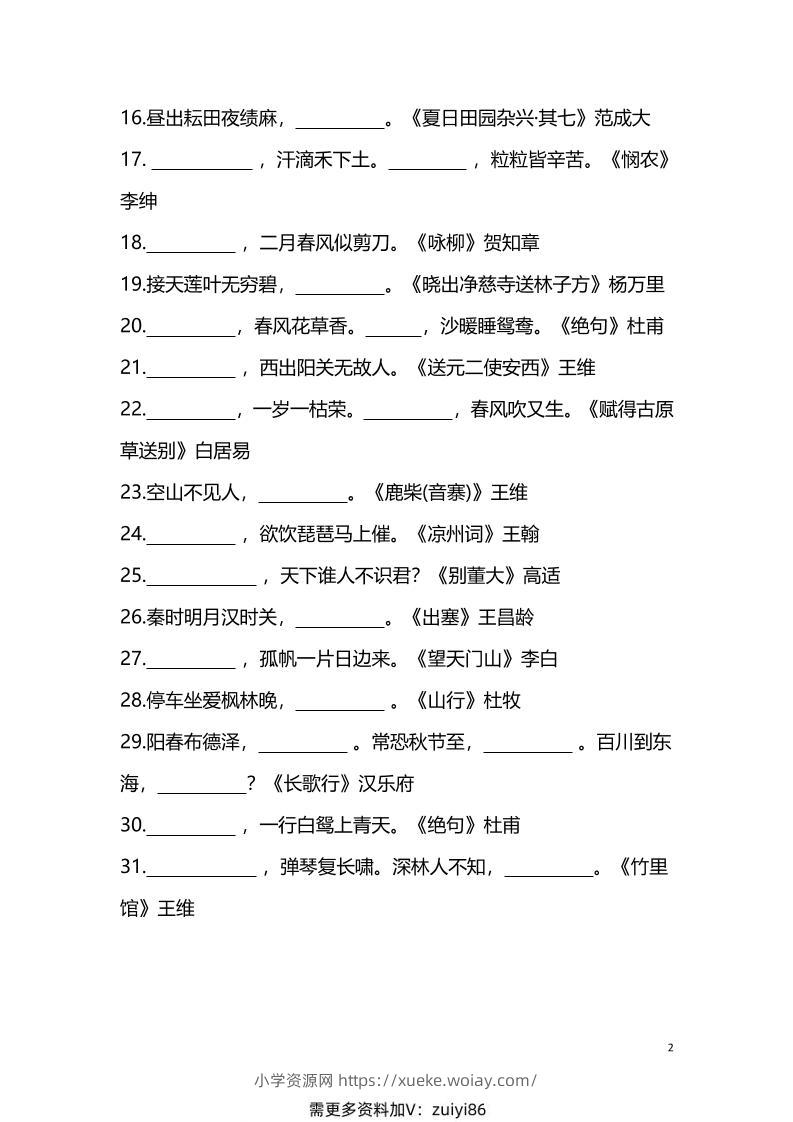 【1-6年级古诗词填空】1-6年级必考的古诗词填空练习(附答案)六上语文admin3个月前发布关注私信03211【1-6年级古诗词填空】1-6年级必考的古诗词填空练习(附答案)六上语文此内容为付费资源,请付费后查看¥10黄金会员免费钻石会员免费立即购买您当前未登录!建议登陆后购买,可保存购买订单格式pdf页数11 页大小989.13 KB付费资源 ——预览已结束,还剩9页未读——开通会员后可免费下载高清完整文档 © 版权声明文章版权归作者所有,未经允许请勿转载。THE END小学语文 喜欢就支持一下吧点赞11 分享QQ空间微博QQ好友海报分享复制链接收藏
