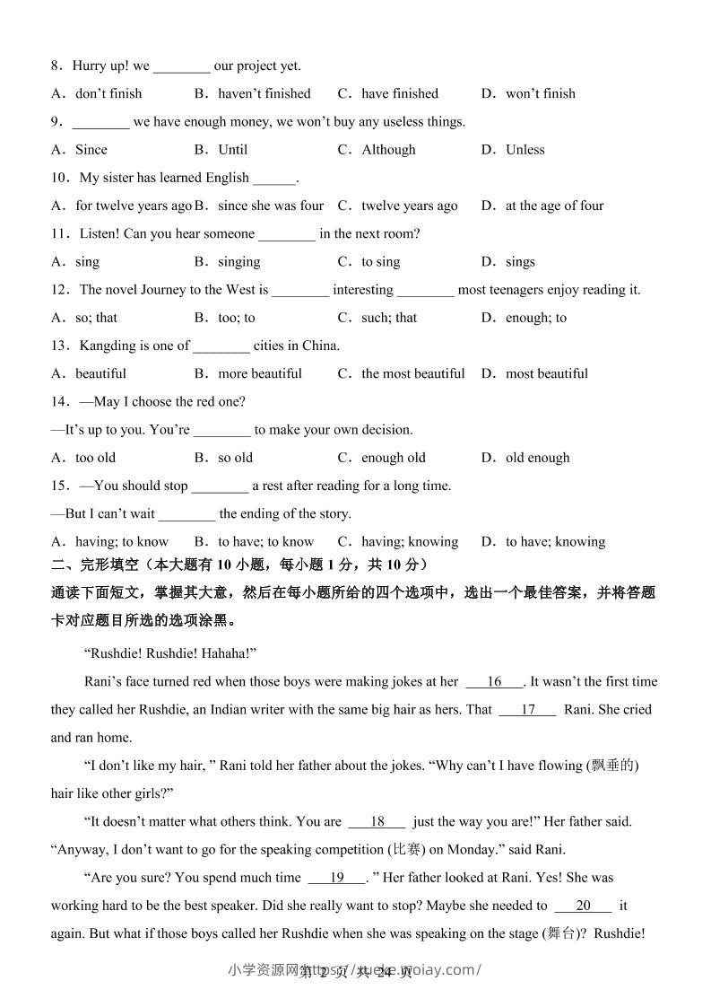 八年级上英语期中模拟卷(外研版)admin2个月前发布关注私信02514八年级上英语期中模拟卷(外研版)此内容为付费资源,请付费后查看¥10黄金会员免费钻石会员免费立即购买您当前未登录!建议登陆后购买,可保存购买订单格式pdf页数24 页大小874.38 KB付费资源 ——预览已结束,还剩22页未读——开通会员后可免费下载高清完整文档 © 版权声明文章版权归作者所有,未经允许请勿转载。THE END初中英语 喜欢就支持一下吧点赞14 分享QQ空间微博QQ好友海报分享复制链接收藏