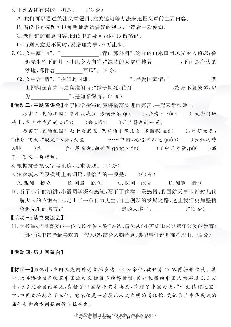 【语文】六上语文期末绝密真题卷4admin1个月前发布关注私信0379【语文】六上语文期末绝密真题卷4此内容为付费资源,请付费后查看¥10黄金会员免费钻石会员免费立即购买您当前未登录!建议登陆后购买,可保存购买订单格式pdf页数8 页大小1.65 MB付费资源 ——预览已结束,还剩6页未读——开通会员后可免费下载高清完整文档 © 版权声明文章版权归作者所有,未经允许请勿转载。THE END小学语文 喜欢就支持一下吧点赞9 分享QQ空间微博QQ好友海报分享复制链接收藏