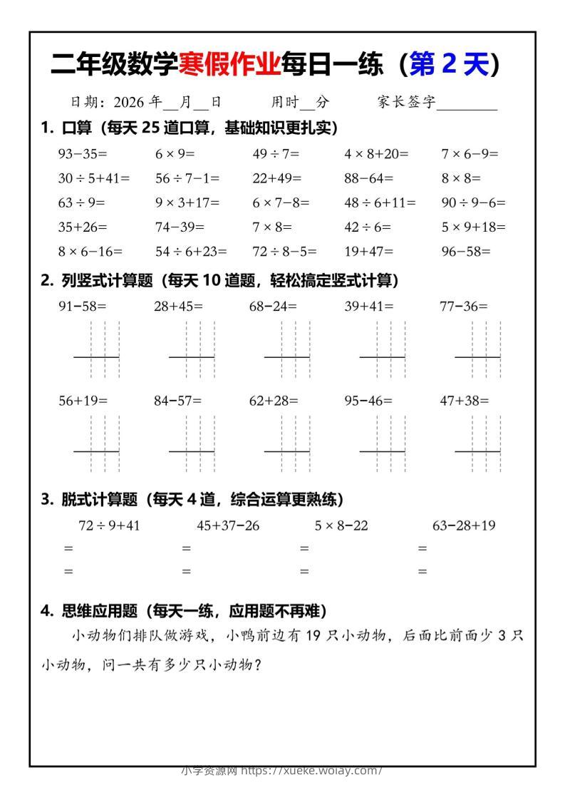 26春二年级数学下寒假作业每日一练30天(口算竖式脱式应用题)30页admin13天前发布关注私信0421426春二年级数学下寒假作业每日一练30天(口算竖式脱式应用题)30页此内容为付费资源,请付费后查看¥10黄金会员免费钻石会员免费立即购买您当前未登录!建议登陆后购买,可保存购买订单格式pdf页数30 页大小6.47 MB付费资源 ——预览已结束,还剩28页未读——开通会员后可免费下载高清完整文档 © 版权声明文章版权归作者所有,未经允许请勿转载。THE END小学数学 喜欢就支持一下吧点赞14 分享QQ空间微博QQ好友海报分享复制链接收藏