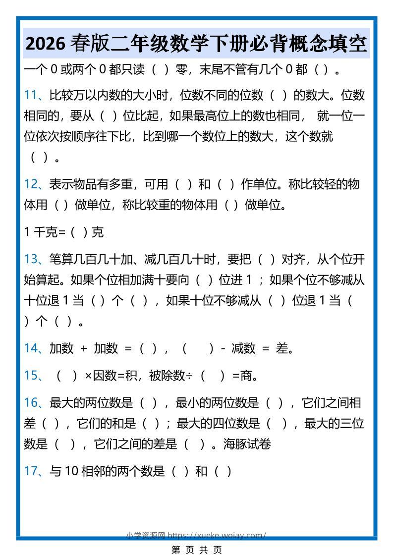 2026春新版二年级下数学必背概念填空admin10天前发布关注私信04792026春新版二年级下数学必背概念填空此内容为付费资源,请付费后查看¥10黄金会员免费钻石会员免费立即购买您当前未登录!建议登陆后购买,可保存购买订单格式pdf页数6 页大小272.18 KB付费资源 ——预览已结束,还剩4页未读——开通会员后可免费下载高清完整文档 © 版权声明文章版权归作者所有,未经允许请勿转载。THE END小学数学 喜欢就支持一下吧点赞9 分享QQ空间微博QQ好友海报分享复制链接收藏